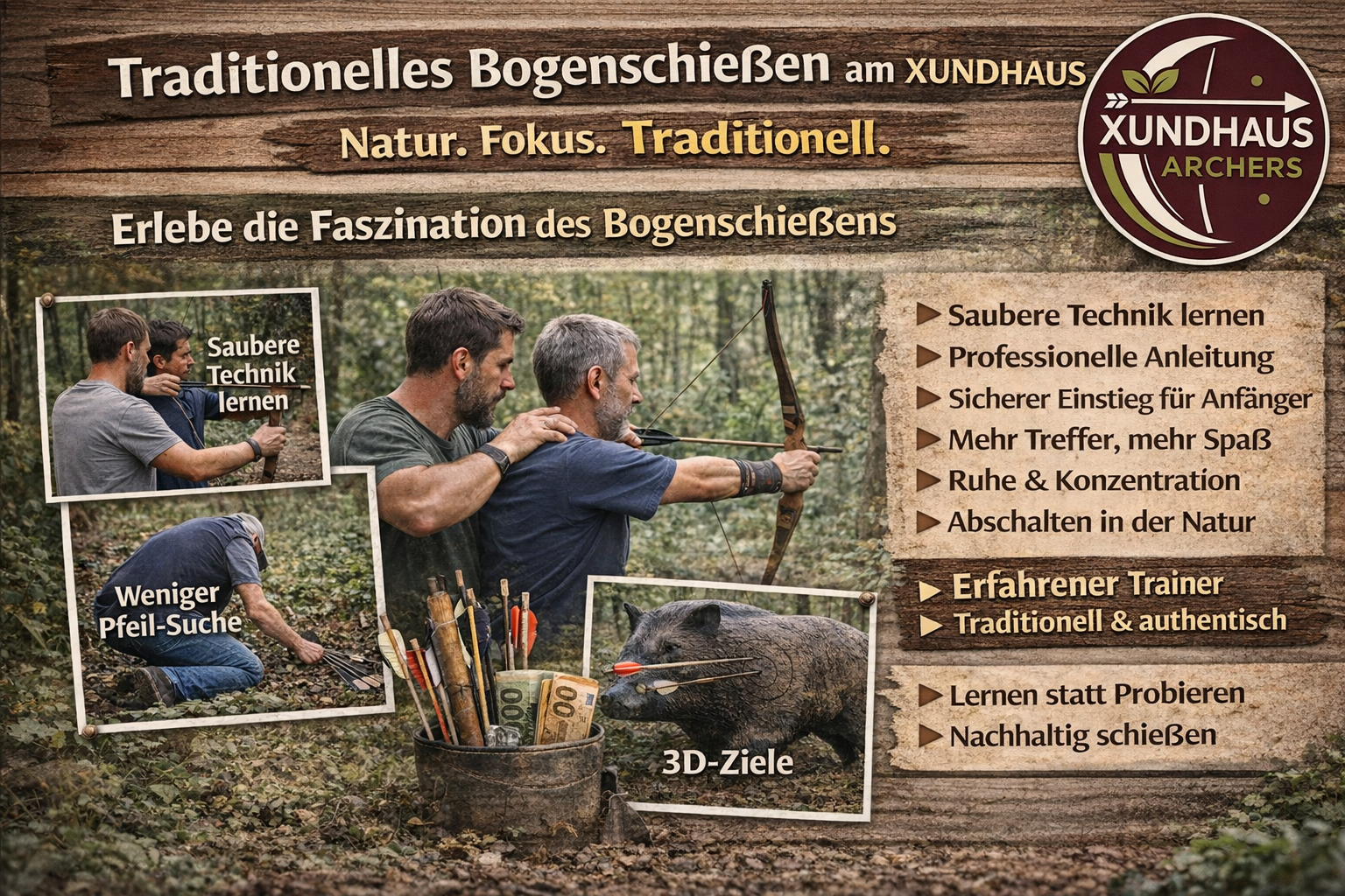 Xundhaus Archers in Wegscheid stehen für traditionelles Bogenschießen mit klaren Grundlagen. Unsere Kurse richten sich an Menschen, die Bogenschießen von Grund auf verstehen, sauber erlernen und gezielt verbessern möchten – ohne technische Hilfsmittel, ohne moderne Zielsysteme, aber mit fundierter Technik und praxisnaher Vermittlung.